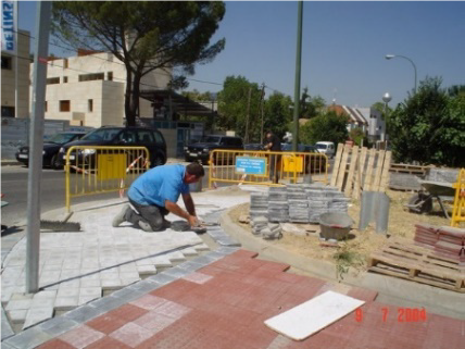 - Reposición puntual del pavimento de aceras en mal estado. Implica el levantado y la reposición de la capa de rodadura en zonas deterioradas de las aceras de la vía pública (material envejecido, falta de material, problemas de nivelación, etc.), que conllevan la sustitución de losetas, baldosas o adoquines, etc. en tramos concretos o delimitados de la misma.