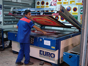 In this section is the silk-screen printing area, where there is a semiautomatic screen printing machine and more than 500 different screens with all the sign symbols. Silkscreen printing can be done on reflective sheets with transparent inks specially designed for signs or can also be done directly on the signs with opaque inks.