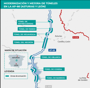 En concreto se trata de la modernización de los túneles de Barrios, Cosera, Oblanca, El Negrón, Vegaviesga, Pando y Entrerregueras, todos ellos ubicados en la autopista AP-66 Campomanes-León, en las provincias de Asturias y León.