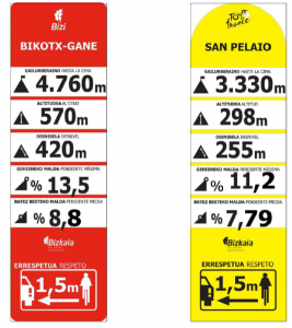 La información, mostrada de forma simple y escueta en carteles laterales al inicio y en la cima del puerto, incluye los principales datos geométricos de la ascensión (longitud, altitud, desnivel, pendiente media y pendiente máxima). Además, se dispondrán hitos kilométricos indicando los kilómetros hasta la cima y la pendiente media del kilómetro correspondiente.